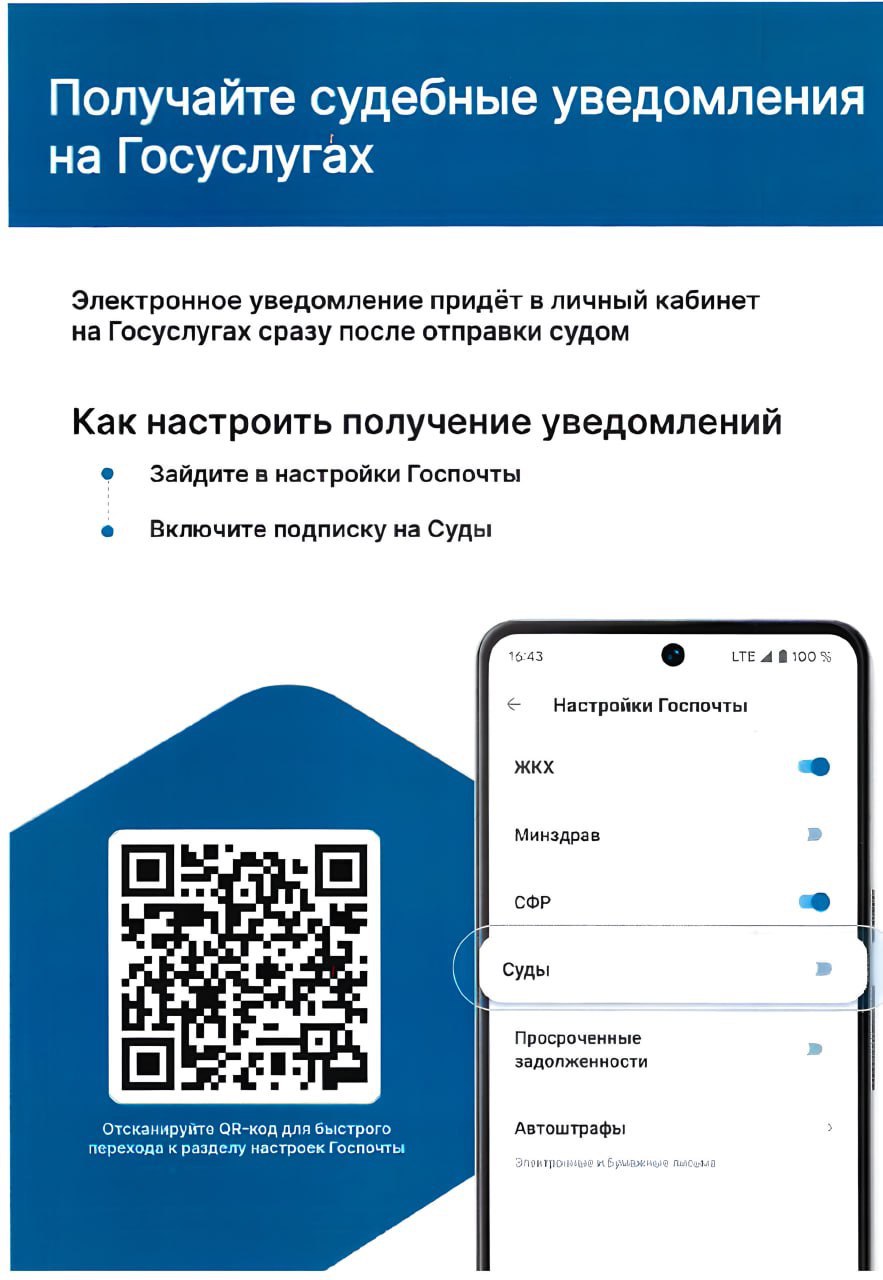 Уведомляем участников процессов о возможности получения судебных электронных писем через Единый портал государственных и муниципальных услуг (портал Госуслуг) Граждане имеют возможность подписаться на портале Госуслуг на рассылку судебных уведомлений. Доставка судебных уведомлений осуществляется в личный кабинет физического лица, индивидуального предпринимателя, юридического лица на портал Госуслуг исключительно при наличии согласия адресата на получение судебных уведомлений. Чтобы получать уведомления из судов, необходимо дать согласие в соответствующем разделе портала Госуслуг в настройках личного кабинета, для этого: 1.Войдите в личный кабинет приложения Госуслуг. 2.В разделе "Профиль" откройте вкладку "Настройка Госпочты". 3.Выберите параметр "Суды" и включите получение электронных писем. Или отсканируйте QR-код, размещенный на изображении. Данное согласие означает, что суд получит возможность доставлять уведомления в электронном виде в личный кабинет гражданина. ![]() Услугу доставки электронных писем можно отключить в любой момент, и тогда корреспонденция снова будет приходить на бумажном носителе. |